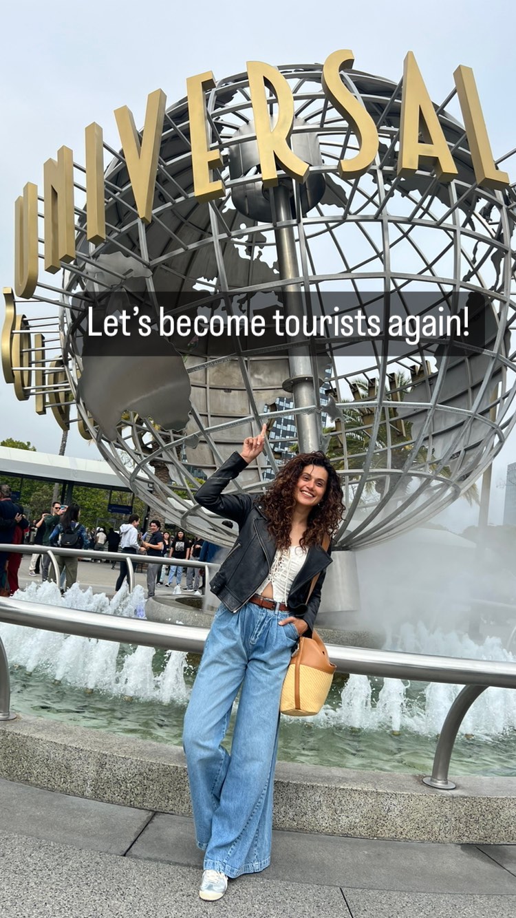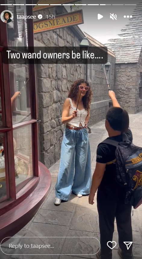 Taking to her Instagram stories, Taapsee first posted a picture of herself posing next to the Universal Studios globe statue. Dressed in a white top, black leather jacket, and baggy denim jeans, she pointed towards the globe with enthusiasm, captioning the image, “Let’s become tourists again!” In another story, she posed in the Hall of Portraits, expressing her excitement about “unlocking the teenager within.” The actress further shared a video clip of herself holding a wand at Hogsmeade, accompanied by another child with a wand, playfully captioning it, “Two wand owners be like…” It is evident that Taapsee thoroughly enjoyed her visit to the Wizarding World of Harry Potter.